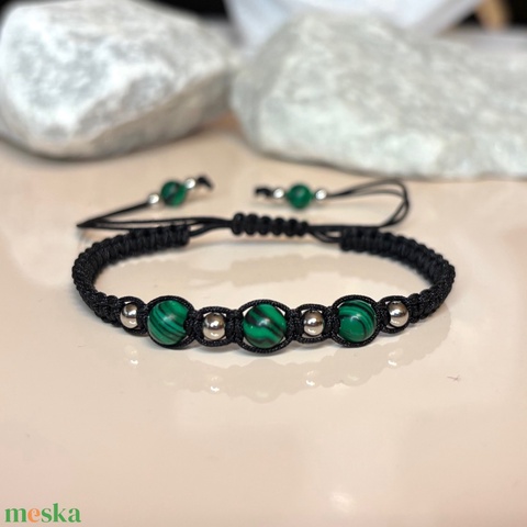 Csomózott makramé állítható méretű karkötő malachit és nemesacél gyöngyökkel