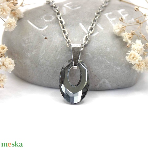 Füstös–ezüstösen csillogó, ovális formájú Aurora kristály ezüst láncon - Helion
