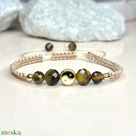 Csomózott makramé állítható méretű karkötő csiszolt tigrisszem ásványgyöngyökkel jing jang medállal