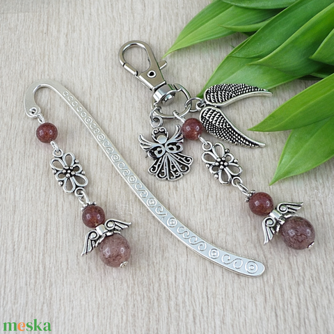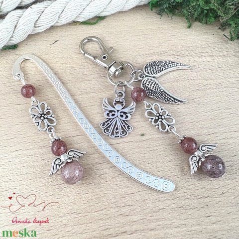 • Könyvjelző, 6 és 8 mm-es eperkvarc ásványgyöngyből készült angyalkával – gyengéd, inspiráló kísérő az olvasás meghitt pillanataihoz