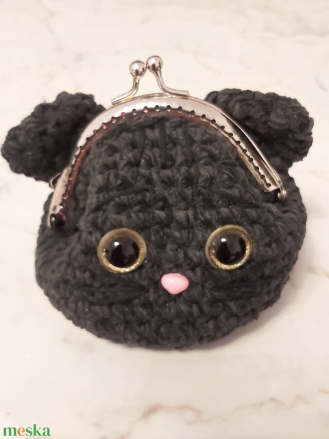 Elegáns puha tapintású fekete horgolt mini cica csatos pénztárca különleges bársonyos zseníliafonalból készítve, csillogó műanyag biztonsági szemekkel, és műanyag biztonsági orral. A cicát formája és a finom textúra igazán különlegessé teszi.
