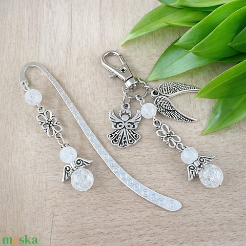 • Könyvjelző, 6 és 8 mm-es roppantott hegyikristály ásványgyöngyből készült angyalkával – egyedi, fényjátékos kísérő az olvasás pillanataihoz