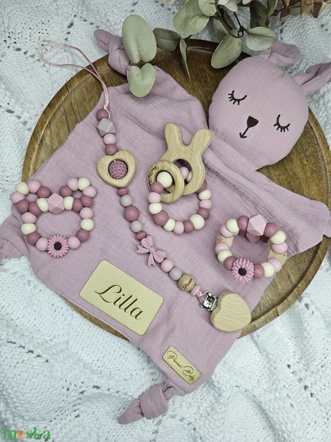 Első ajándékom - Mályva nyuszis szundikendő Babaváró ajándék Babaköszöntő ajándékbox
