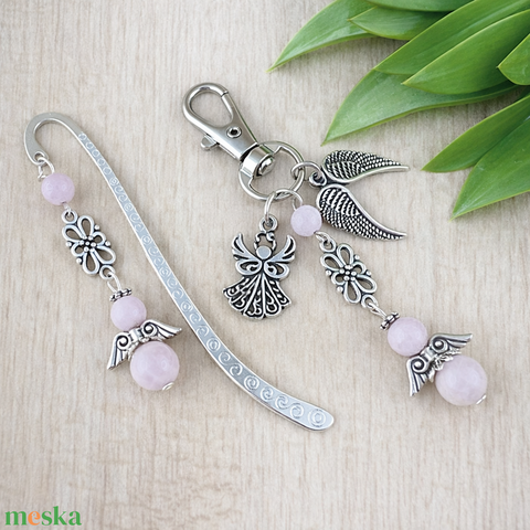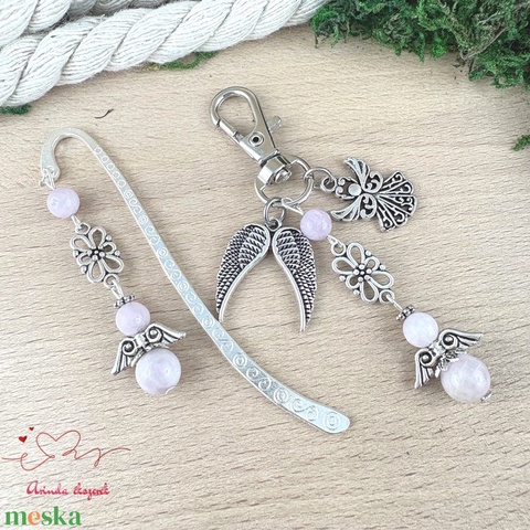 • Könyvjelző, 6 és 8 mm-es kunzit ásványgyöngyből készült angyalkával – meghitt, nyugodt kísérő az olvasás csendes pillanataihoz