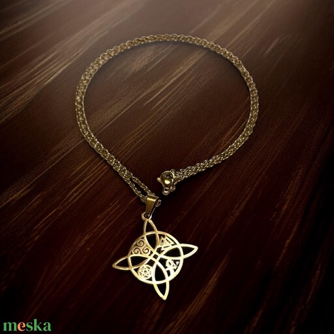 Elegáns, arannyal futtatott nemesacél nyaklánc finom lánccal és részletgazdag, kelta ihletésű medállal. Az összefonódó motívumok az egységet és a harmóniát jelképezik, így tökéletes választás mindennapi viselethez vagy ajándéknak. A medál 3 cm-es, a lánc 50 cm hosszú.