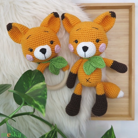 Horgolt róka figura és csörgő szett - Babaköszöntő ajándékcsomag (narancs)