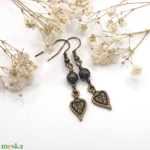 Fülbevaló szív alakú függőből és márványos, sötétzöld cseh üveggyöngyből