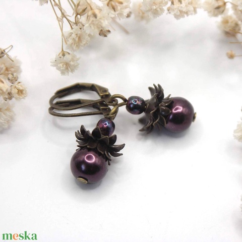 Fülbevaló sötétlila üvegtekla gyöngyökből, különleges gyöngykupakokkal kiegészítve