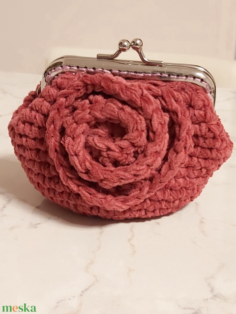 Elegáns puha tapintású mályva színű horgolt mini csatos pénztárca különleges bársonyos zseníliafonalból készítve. Az elejét horgolt szívvirág teszi egyedivé. A pénztárca mérete 10 cm x 10 cm, így tökéletes választás aprópénzhez, fülhallgatóhoz, gyűrűkhöz, gyógyszerekhez, vagy bármilyen kis kincshez, amit jó ha mindig kéznél tartasz.