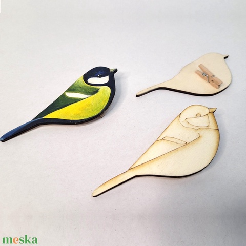 Fenyőerdő madarai – kifesthető lézervágott fa dísz szett csipesszel (5–7 cm)