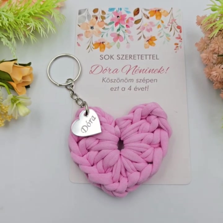 Horgolt szív kulcstartó gravírozott medállal, egyedi ajándékkártyán - Ajándék tanító néninek, óvó néninek (08)
