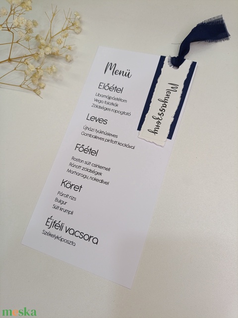 Esküvői menü és ültető kártya szalaggal