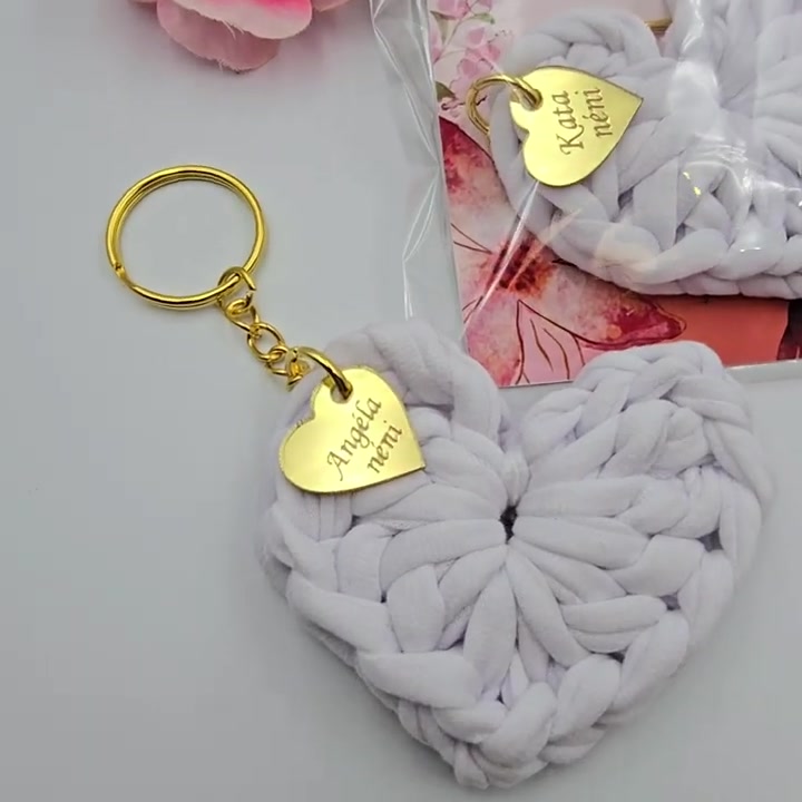 Horgolt szív kulcstartó gravírozott medállal, egyedi ajándékkártyán - Ajándék tanító néninek, óvó néninek (11)