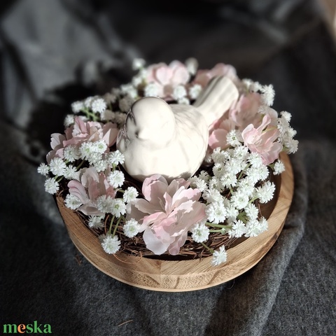 fa alap, kerámia madár, selyem és műanyag virág