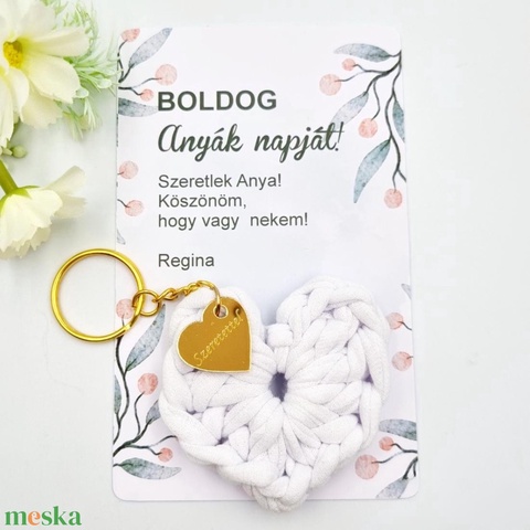 Horgolt szív kulcstartó gravírozott medállal, egyedi ajándékkártyán - Anyák napi ajándék (02)