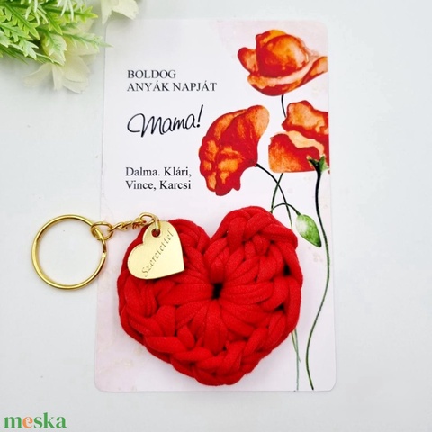 Horgolt szív kulcstartó gravírozott medállal, egyedi ajándékkártyán - Anyák napi ajándék (03)