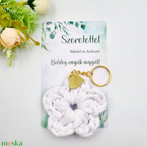 Horgolt virág kulcstartó gravírozott medállal, egyedi ajándékkártyán - Anyák napi ajándék (12)