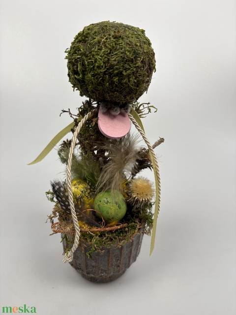 Tavaszváró, két fürjtojásos, gömbf5cskás asztaldísz szürke-mézbarna kaspóban, növényi részekkel (TS-05)