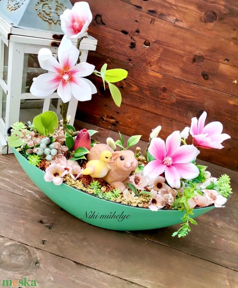 Magnólia dekoráció, Tavaszi asztaldísz, húsvéti kosár dekoráció, csónak dekor