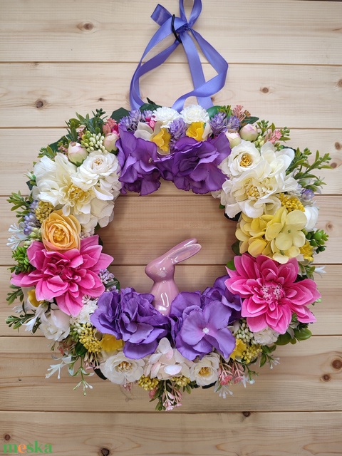 - Anyaga: koszorú, selyemvirágok, szalag, kerámia nyuszi