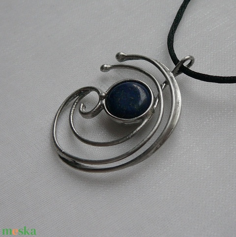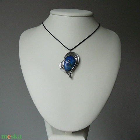 A medál tiffany technikával készült lápisz lazuli és ólommentes, ezüsttartalmú ón felhasználásával. A díszítés szintén saját készítésű, nem tartalmaz gyári elemeket. A fémrészt óezüstre patináztam, lekezeltem antioxidánssal és lelakkoztam, hogy sokáig szép maradjon.