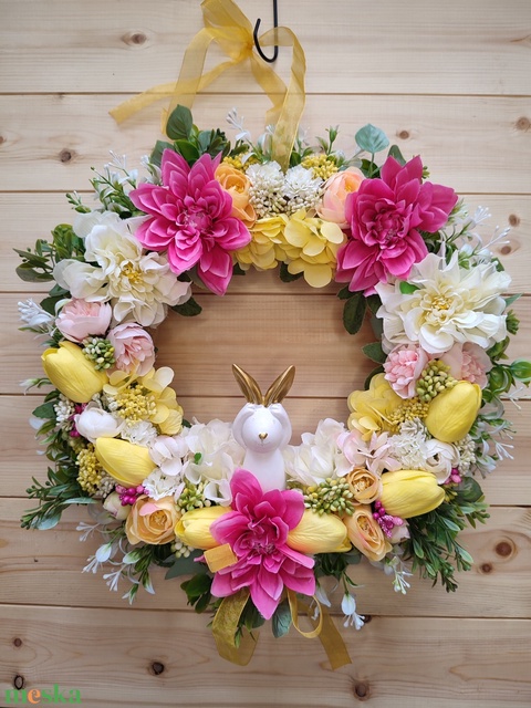 - Anyaga: koszorú, selyemvirágok, szalag, kerámia nyuszi