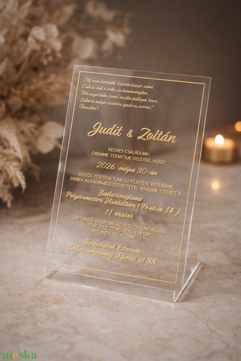 Modern plexi esküvői meghívó arany felirattal