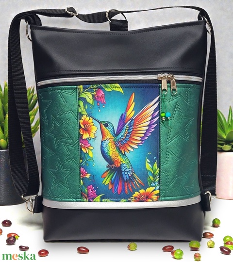 Kolibri madár 3in1 textilbőr hátizsák oldaltáska fekete-zöld