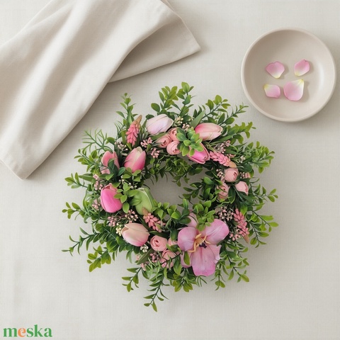 Rózsaszín tulipános tavaszi koszorú - természetes hatású, élethű virágokkal