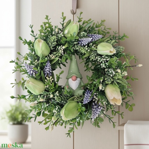 Tulipános tavaszi koszorú manóval- természetes hatású, élethű virágokkal