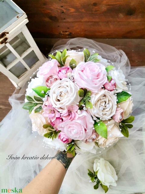 Gyöngyös pasztell Menyasszonyi csokor, örökcsokor, selyemvirág csokor kitűzővel