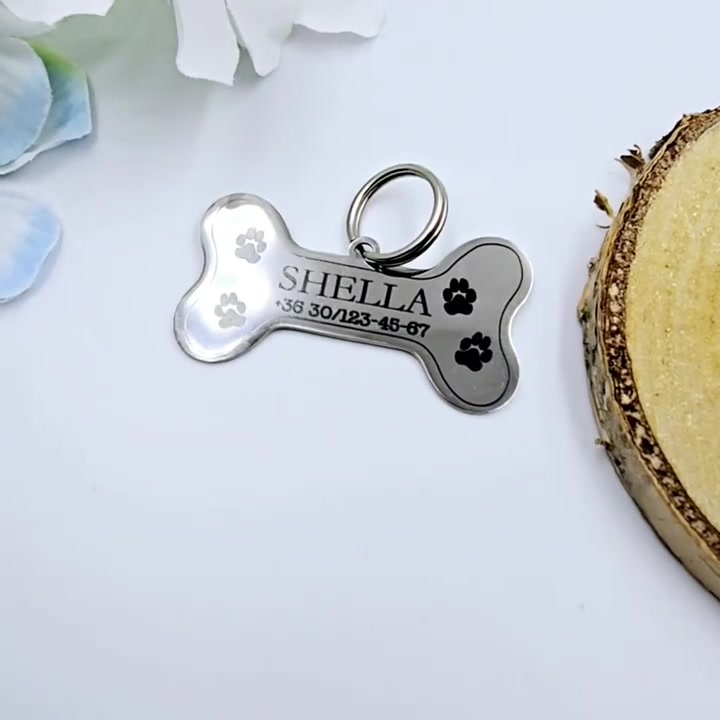 Csont alakú kutyabiléta saját kutyád nevével, a gazda telefonszámával