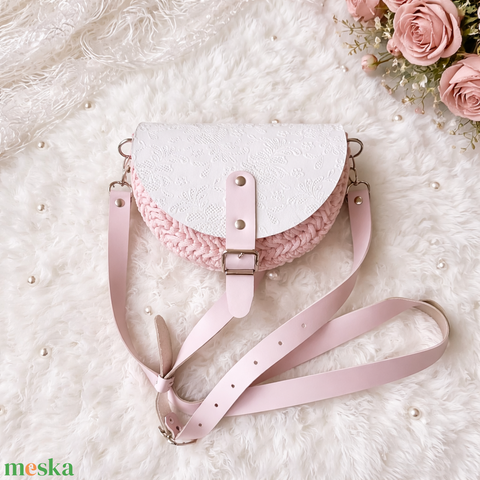 Horgolt babarózsaszín crossbody táska csipkés bőr fedlappal