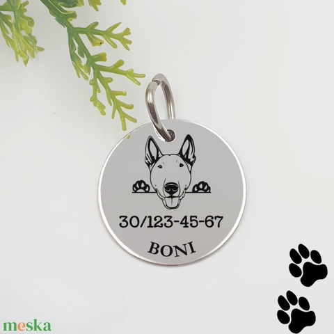 Bull terrier kutyabiléta saját kutyád nevével, telefonszámmal