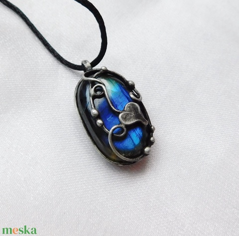 A medál Tiffany technikával készült labradorit, réz és ólommentes, ezüsttartalmú ón felhasználásával. A díszítés szintén saját készítésű, nem tartalmaz gyári elemeket. A fémrészt óezüstre patináztam és lelakkoztam, hogy sokáig szép maradjon.
