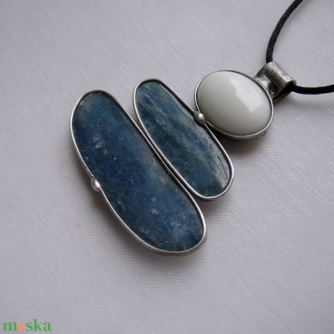 A medál Tiffany technikával készült kianit és ólommentes, ezüsttartalmú ón felhasználásával. A díszítés szintén saját készítésű, nem tartalmaz gyári elemeket. A fémrészt óezüstre patináztam, lekezeltem antioxidánssal és lelakkoztam, hogy sokáig szép maradjon.