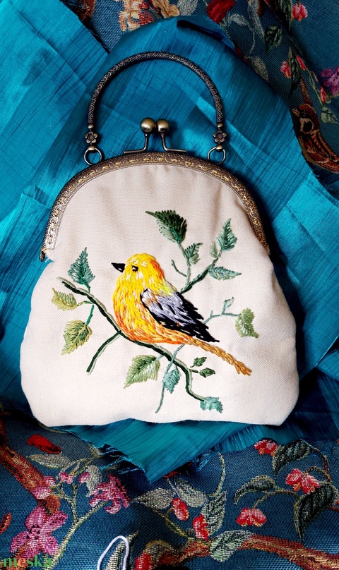 Kézzel hímzett pamut táska fém kerettel – Madár motívum, egyedi kézműves darab