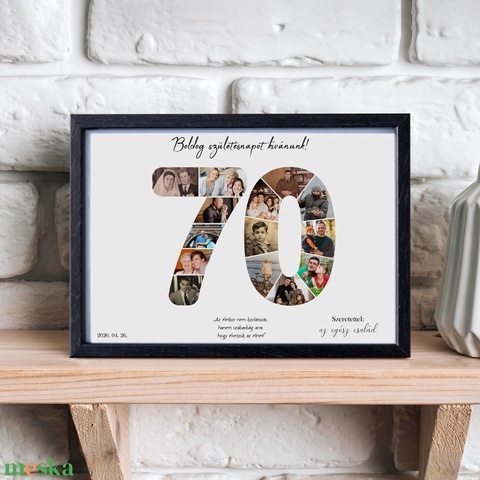 70-es szülinapi fotókollázs A/4-es méretben dátummal, aláírással (digitális kép vagy fotópapírra nyomtatva, keretezve)