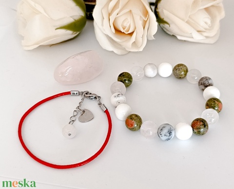 - Anyaga: gumis damil, hengerbőr, nemesacél, rózsakvarc, unakit, gyöngyház, merlinit