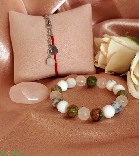 - Anyag/Összetevő gumis damil, hengerbőr, nemesacél, rózsakvarc, unakit, gyöngyház, merlinit