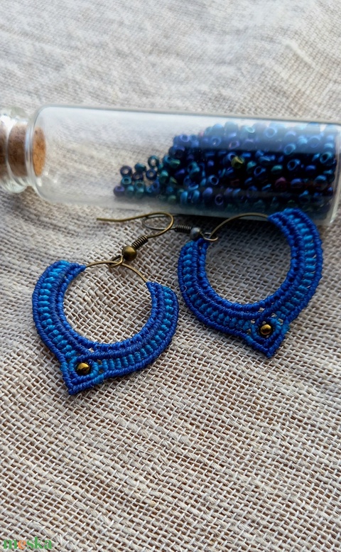 Kék/türkizkék/karika, makramé fülbevaló