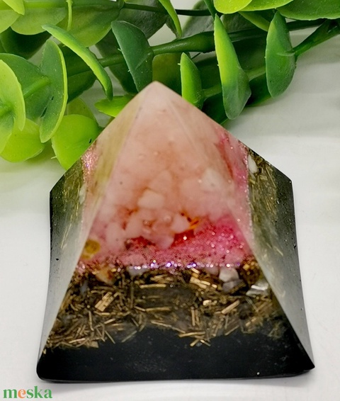 Szeretet, harmónia,piramisa. Tartalmaz, rózsakvarcot, pink opalt,arany rutillt rézforgácsot és az elmaradhatatlan rézspirált.Valamint Shungitport.