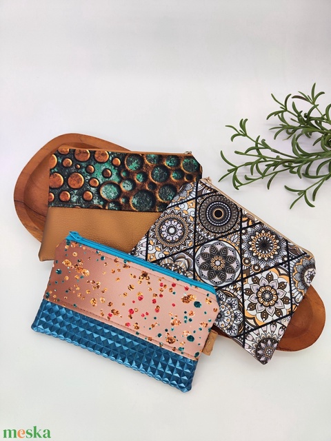 Mini cipzáros tároló - petrolkék gyöngyös, barna mozaik, bronz buborék minta