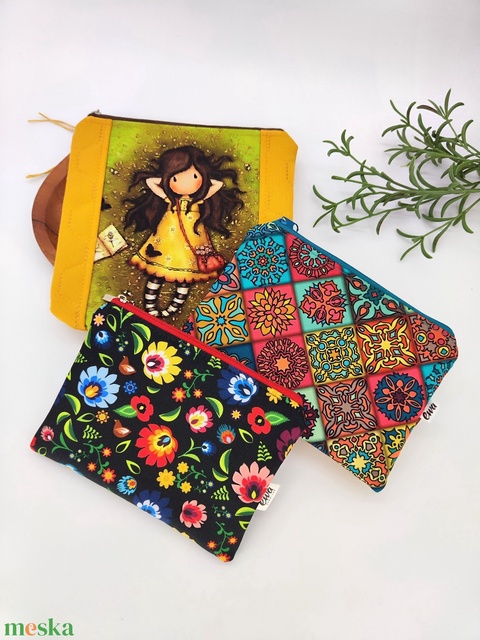 Mini cipzáros tároló -Mustár kislány, színes mozaik, népi virágospiros cipzár
