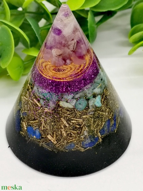Sungit-Orgonit kúp-Sungit-Orgonit kúp- amazonittal, lapis lazulival, ametiszttel, sungitporral bronzforgáccsal,és az elmaradhatatlan rézspirállal