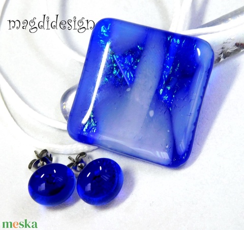 Sejtelmes fehér-kék csillogás üvegékszer szett, nyaklánc, stiftes fülbevaló