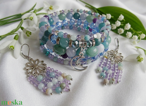 Aventurin, Akvamarin, Ametiszt és Kalcedon – „Holdfény Álma” 5 soros Memóriadrótos Karkötő és Fülbevaló Szett