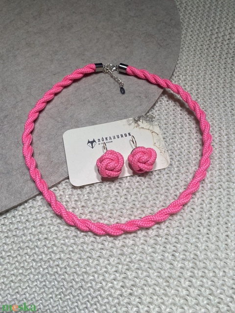 Sodrás nyaklánc és Szeder maxi bogyós fülbevaló zsinórékszer szett, kézzel csomózott, neonpink
