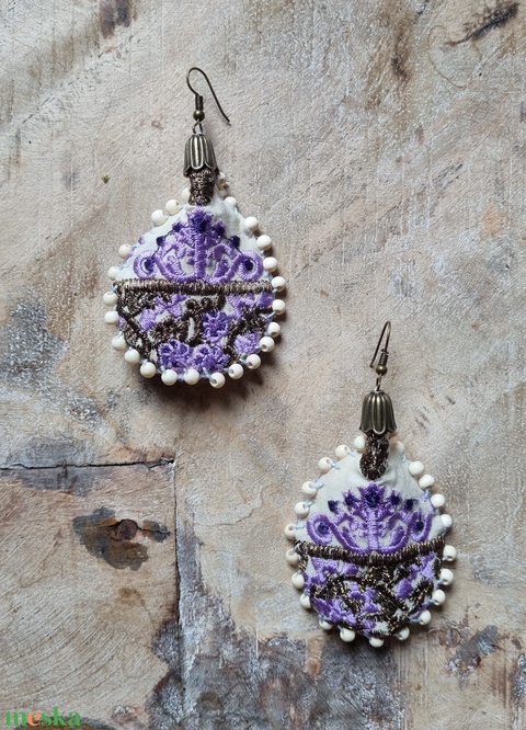 Cseppnyi estély- hímzett fülbevaló fehér/lila/bronz
