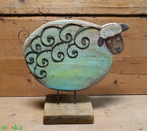 Fából készült festett rusztikus, antikolt bárány fatalpon